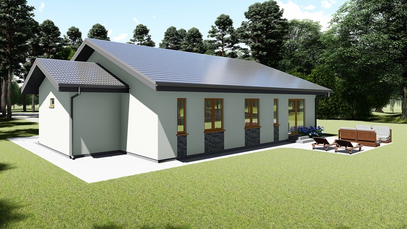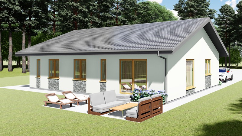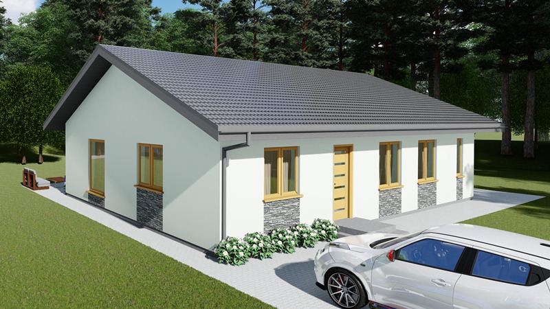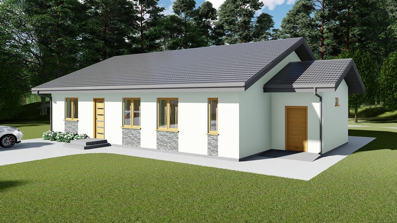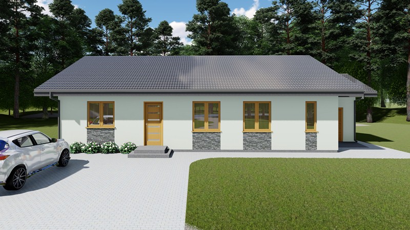 Ērta vienstāvīga ģimenes māja ar atsevišķu saimniecības telpu. Mājā ir ieplānota plaša studio tipa viesistaba apvienota ar virtuvi, četras guļamistabas, vannas istaba, katlu telpa un saimniecības telpa. Saimnieku guļamistabai paredzēta atsevišķa garderobe un dušas telpa ar tualeti.