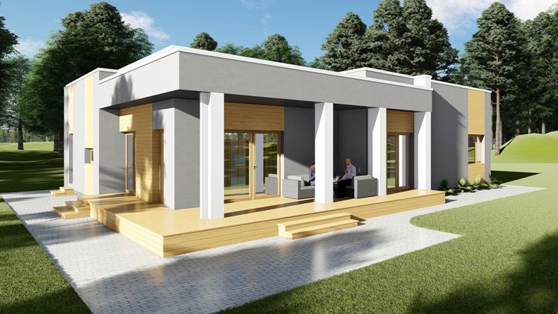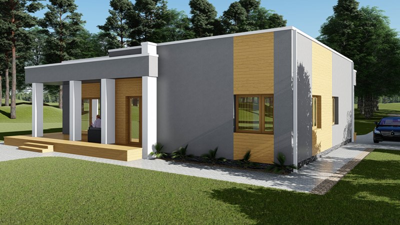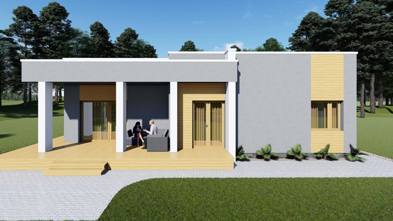 Mājai ieplānota plaša terase un lievenis. Tehniski iespējams piebūvēt nojumi automašīnai.