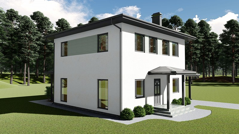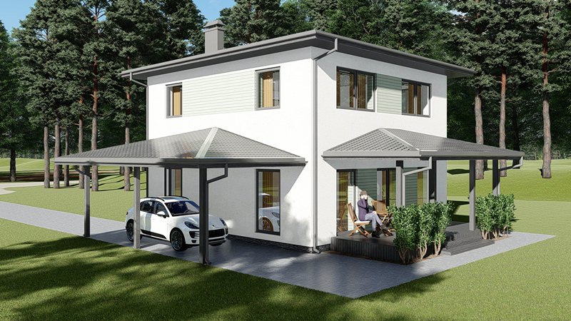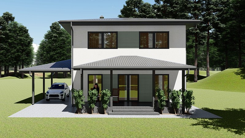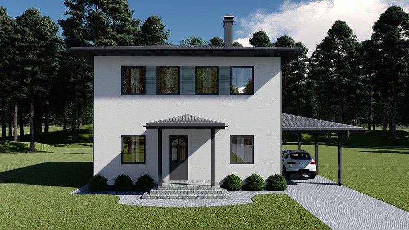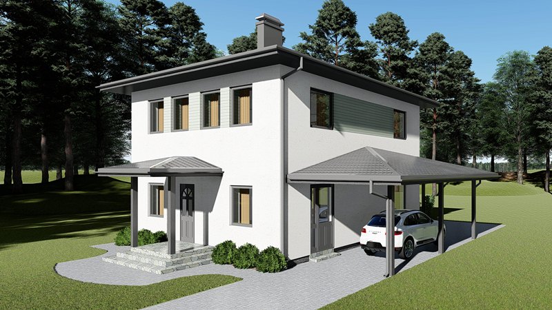 Divstāvu ģimenes māja ar terasi zem jumta un nojumi automašīnai.