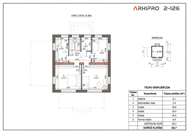 Mājā ir plaša viesistaba apvienota ar virtuvi, kabinets, katlu telpa un sanmezgls pirmajā stāvā. Otrajā stāvā trīs guļamistabas, vannas istaba un saimniecības telpa.
