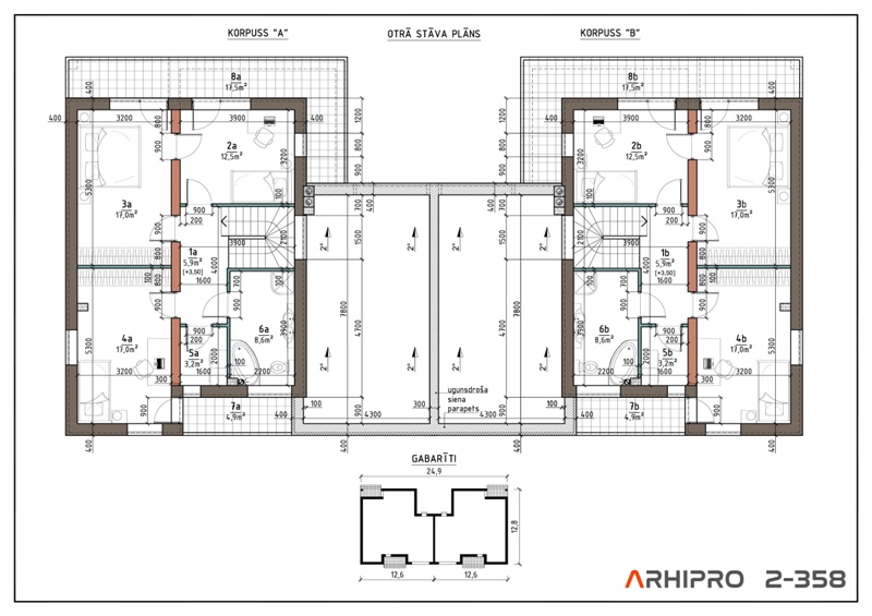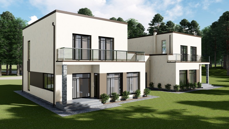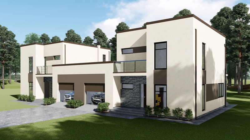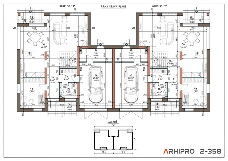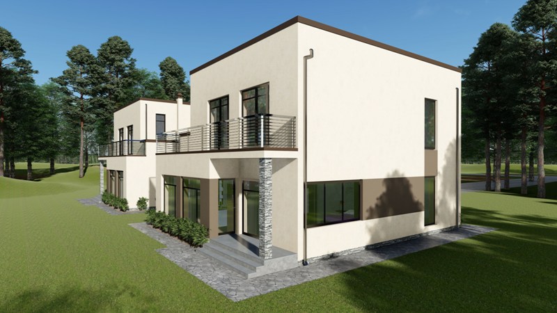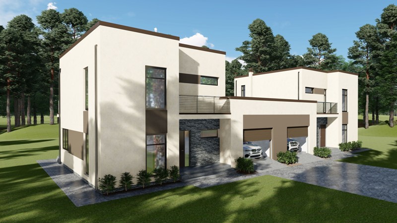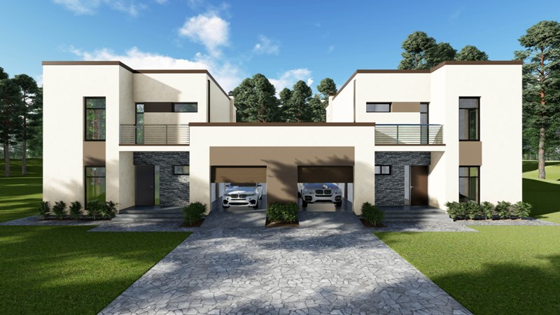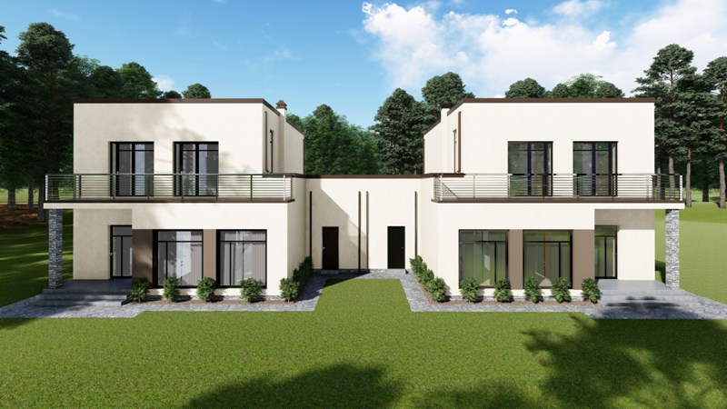 Plaša divstāvīga dvīņu māja ar simetrisku plānojumu. Katram korpusam pirmajā stāvā ir paredzēta ļoti plaša viesistaba apvienota ar virtuvi, kabinets, dušas telpa ar tualeti un garāža ar katlu telpu. Otrajā stāvā trīs guļamistabas un vannas istaba. Pie ārtelpām ir ieplānota terase pirmajā stāvā, un plaši balkoni otrajā stāvā.